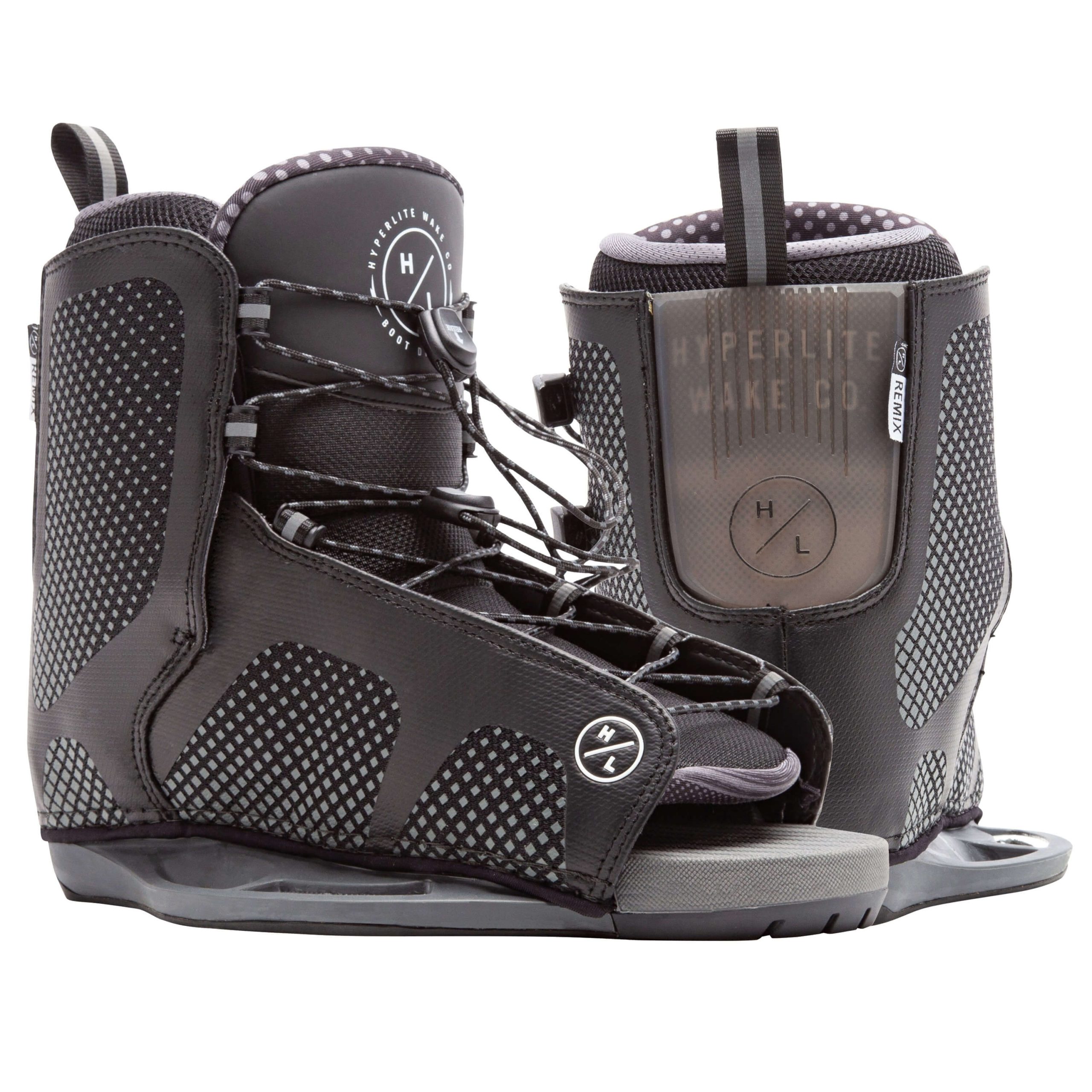 No nonsense function and comfort. Solid traditional design. The Hyperlite Remix Wakeboard Binding is supportive yet easy-to-get-into adjustable and sharable wakeboard binding. The Remix features Dual Lace Zones like more expensive bindings, plus the plushness you come to expect from an open-toe. The 3D molded tongue provides maximum comfort and solid board control. The Remix Binding is an excellent choice for beginner to intermediate riders looking for a comfortable, user-friendly option.